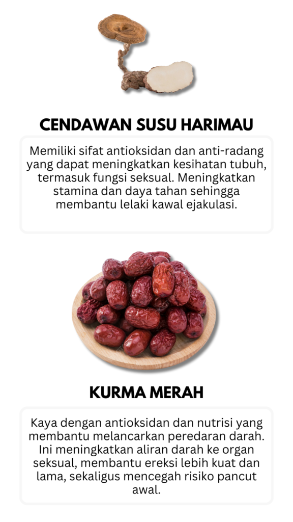 Dengan peningkatan stamina dan tenaga melalui bahan-bahan aktif seperti Kurma Merah dan Tongkat Ali, ia boleh membantu mengatasi masalah seperti pancut awal melalui kawalan yang lebih baik semasa hubungan seksual.